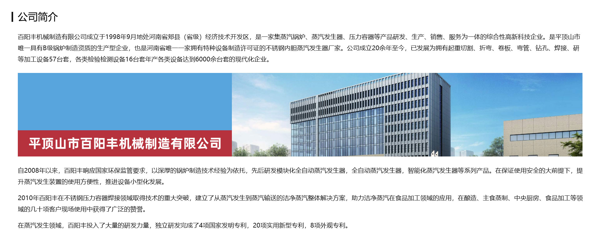 百陽(yáng)豐機(jī)械制造有限公司成立于1998年9月地處河南省郟縣(省級(jí))經(jīng)濟(jì)技術(shù)開(kāi)發(fā)區(qū),是一家集蒸汽鍋爐、蒸汽發(fā)生器、壓力容器等產(chǎn)品研發(fā)、生產(chǎn)、銷(xiāo)售、服務(wù)為一體的綜合性高新科技企業(yè)。是平頂山市一家具有B級(jí)鍋爐制造資質(zhì)的生產(chǎn)型企業(yè),也是一家擁有特種設(shè)備制造許可證的不銹鋼內(nèi)膽蒸汽發(fā)生器廠家。公司成立20余年至今,已發(fā)展為擁有起重切割、折彎、卷板、彎管、鉆孔、焊接、研等加工設(shè)備57臺(tái)套,各類(lèi)檢驗(yàn)檢測(cè)設(shè)備16臺(tái)套年產(chǎn)各類(lèi)設(shè)備達(dá)到6000余臺(tái)套的現(xiàn)代化企業(yè)。